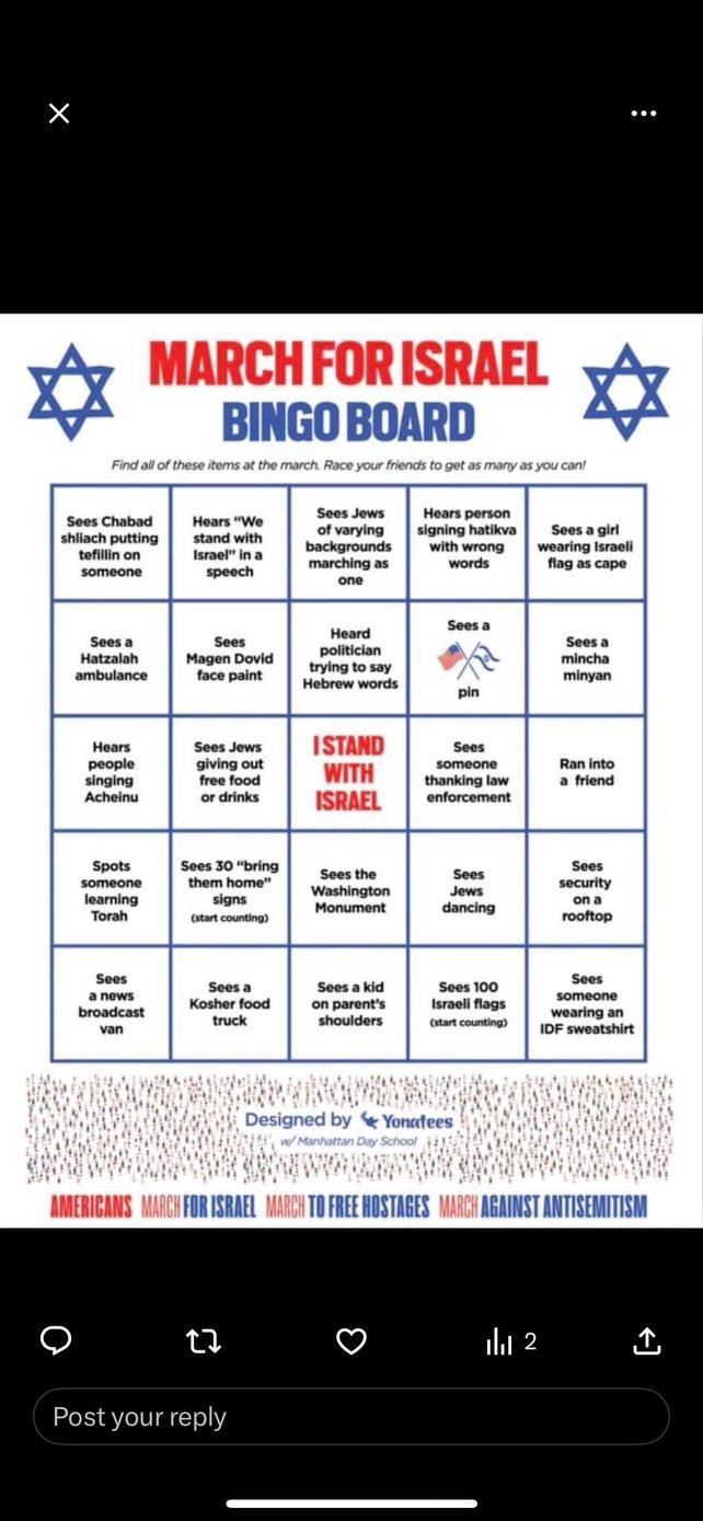 “That feeling of unity was palpable as we flooded the National Mall on Tuesday: 290,000 of us โ religious and secular, left-wing and right-wing โ put aside our differences to focus on supporting Israel during this dark time, calling for the immediate release of all hostages held in Gaza, and countering the antisemitism surging through the veins of our countryโs institutions and public squares.”