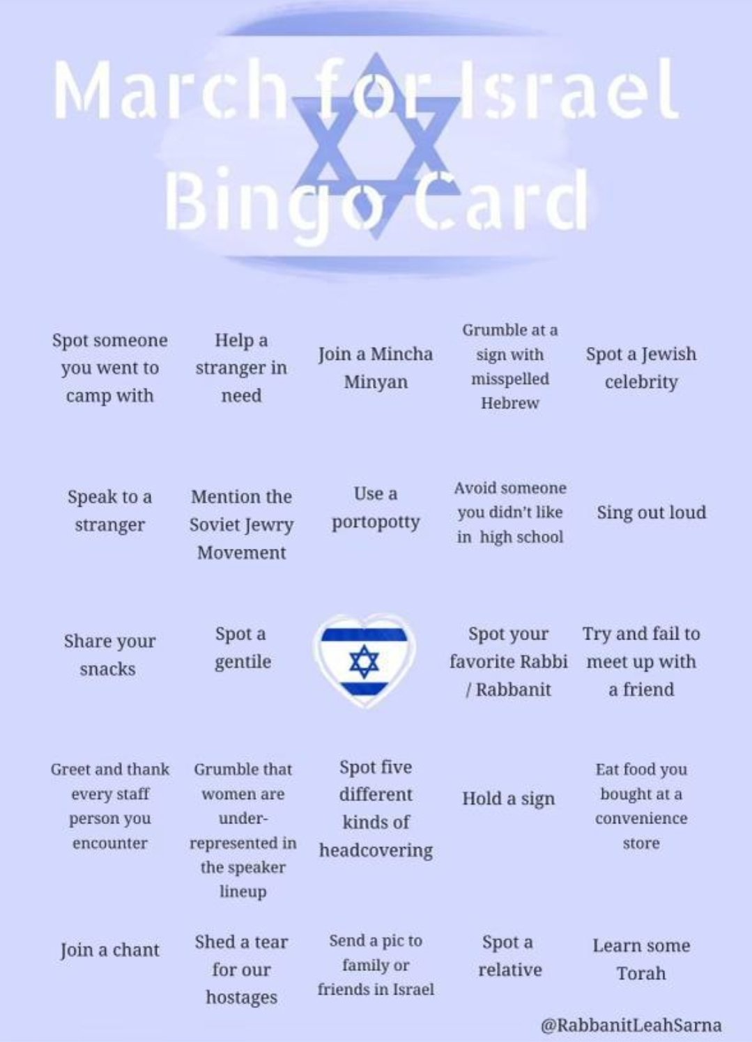 First one to declare BINGO gets a hearty clap on the back, a “Yasher Koach” and a “Siman Tov U’Mazel Tov” redeemable at your next shul appearance, Aliyah, or similar gathering place! ๐